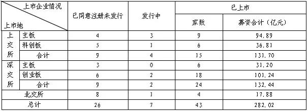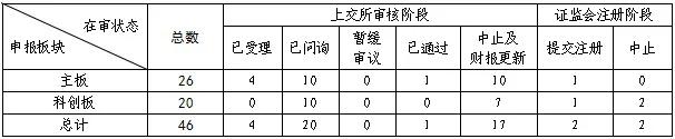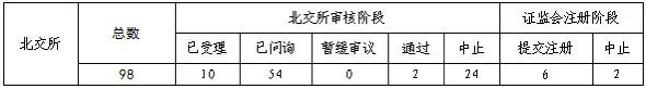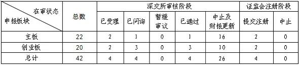 截至6月1日,各板块在审企业共186家。其中上交所46家(主板26家,科创板20家),深交所42家(主板22家,创业板20家),北交所98家。