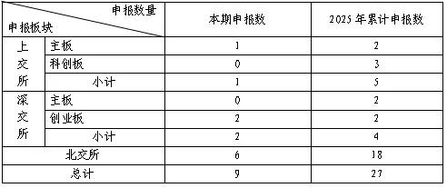 本期(5月26日—6月1日)新增申报企业9家,其中上交所主板1家,深交所创业板2家,北交所6家。